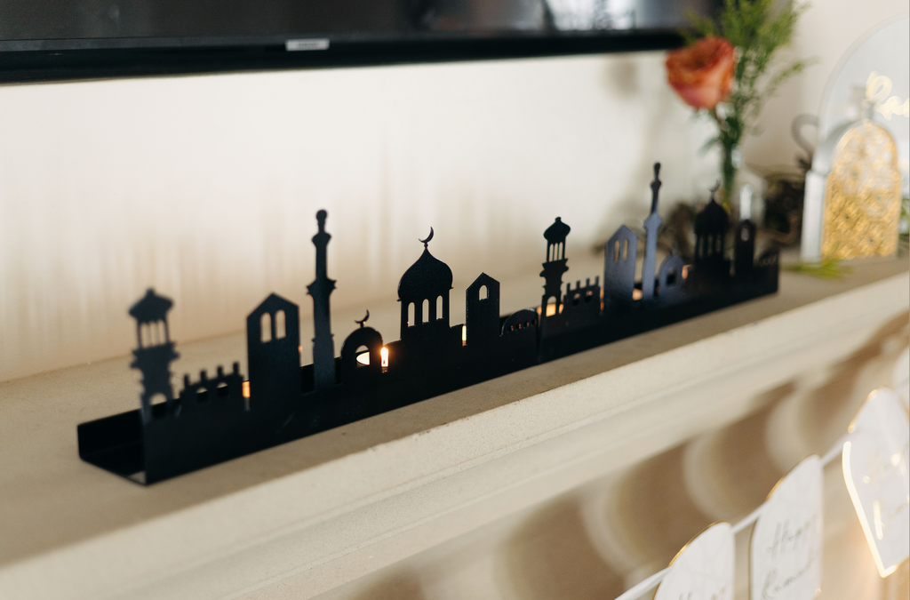 Eid, Ramadan, decor, party, Eid gifts and traditions, Islamic holidays, Ramadan fasting, Eid, Ramadan, Party, Decor, Holiday, Celebrate, Trendy, Elevated style, modern, elegant, Candle holder, Arabian Cityscape metal holder, Decor, Party, Vibey